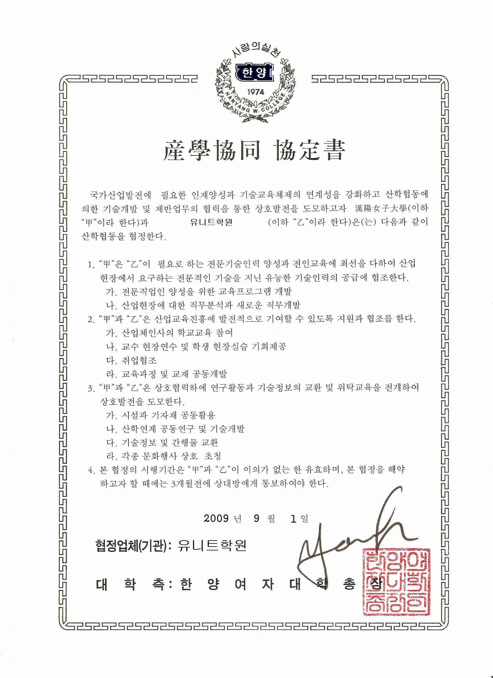 2009. 09 한양여자대학 산학협동 체결